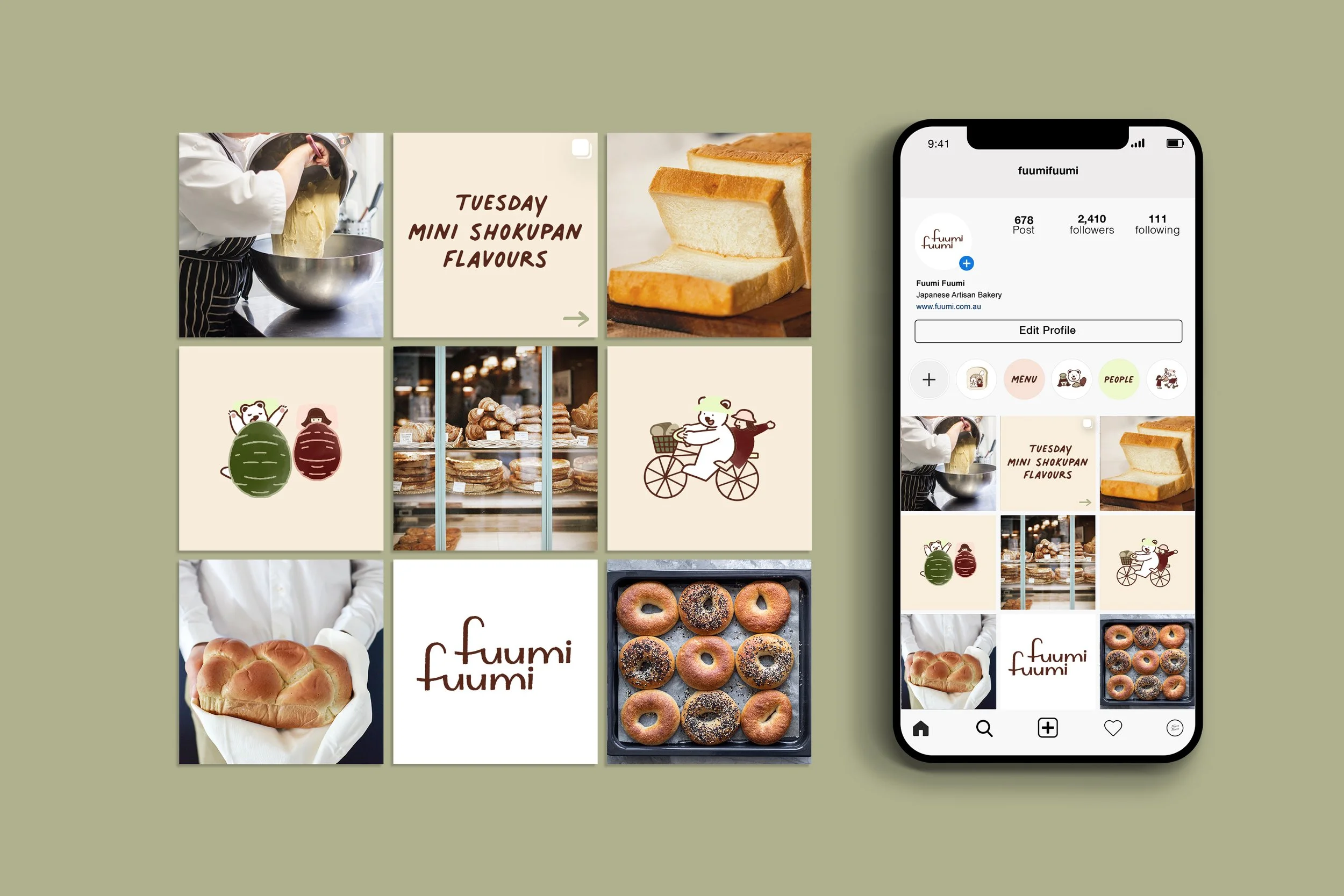 This thoughtful selection captures the bakery's essence and represents different seasons, creating a visually appealing and harmonious brand experience. Fuumi Fuumi's brand is embodied by a delightful mascot duo—a bear and a little girl. The bear symbolises the protective and caring nature of the bakery, while the little girl represents either the customers or the bakery products. To ensure brand consistency, a range of mascot variations has been created for use across various brand collateral. These variations showcase the bear and girl engaging in different activities, such as Japanese bakery making, highlighting the shop's hero products, and embracing Melbourne's unique lifestyle. The development of the characters, slogans and taglines have also found their way into social media marketing, takeaway packaging and collateral rollout.